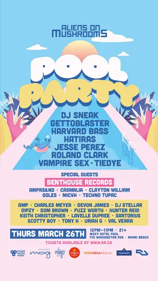 The Aliens On Mushrooms Pool Party Miami Music Week 2026 takes place on Thursday, March 26, 2026, at Moxy Miami South Beach in Detroit. This event showcases a vibrant pool party atmosphere as part of the Miami Music Week festivities. Attendees can look forward to a diverse range of electronic music spanning throughout the day from 12 PM to 11 PM, taking over three rooms in the venue.