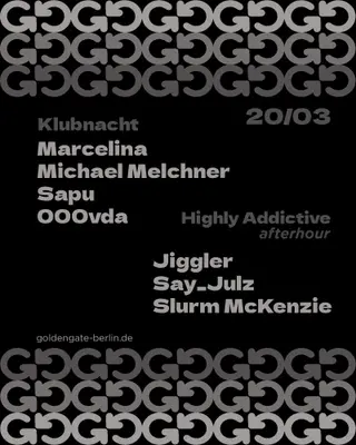 On Friday, March 20, 2026, Golden Gate in Berlin will host the Klubnacht + Highly Addictive Afterhour. This event will feature a night dedicated to electronic music, showcasing a diverse selection of artists. Set in one of Berlin's unique locations, it is a pivotal point for both local and visiting fans of the electronic scene.