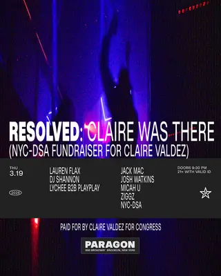 Resolved: Claire Was There (DSA fundraiser for Claire Valdez) is scheduled for Thursday, March 19, 2026, at Paragon in New York City. This event aims to support Claire Valdez, a State Assemblymember, union organizer, and candidate for Congress in New York’s 7th Congressional District. Attendees are encouraged to rally in support of the working class through a night filled with Techno and House music.